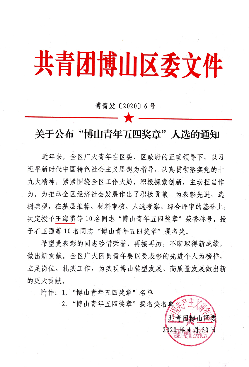 2020年4月30日,共青團淄博市博山區委員會組織召開了“綻放戰役青春 堅定制度自信”主題宣講暨優秀青年事跡分享會。區委常委、組織部部長楊發磊,副區長李林出席會議。會上授予我公司員工王海雷等10名同志“博山區青年五四獎章”榮譽稱號。