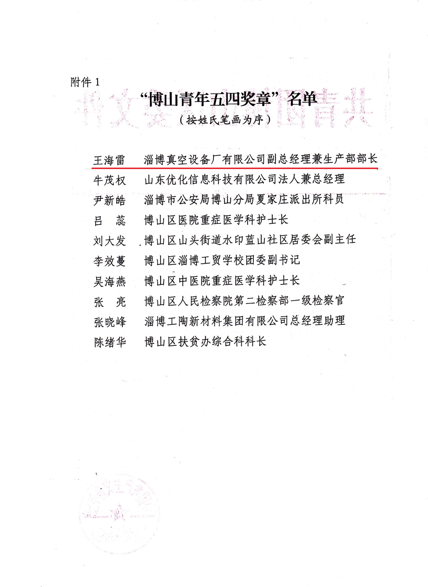 這次殊榮的獲得不但是對王海雷同志個人突出業績的表彰,更是對公司工作進步與發展的肯定。雙山真空為擴大規模及發展的需要,自2020年3月15日遷至山東省淄博市博山區西外環路296號新廠址,公司將以此次搬遷為一個新的起點,加快高質量發展和產業轉型升級,努力構建全面發展的新格局,這需要青年員工的積極參與和不懈努力。就像習總書記寄語的那樣:“青年一代的理想信念、精神狀態、綜合素質,是一個國家發展活力的重要體現,也是一個國家核心競爭力的重要因素”。同樣,青年興則企業興,青年強則企業強。新的發展形勢給我們青年員工提出了新的要求,讓我們共同攜起手來,繼承和發揚“五四”光榮傳統,做一代有理想、有本領、有擔當的新時代青年,為開創雙山真空更加燦爛美好的明天而努力奮斗!